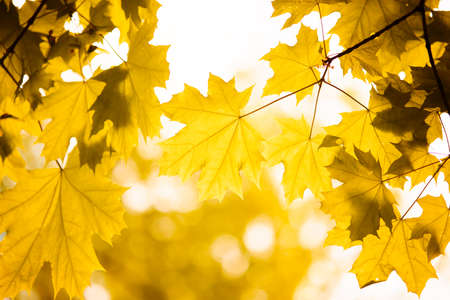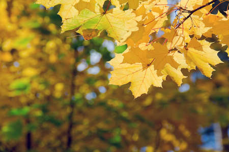 Yellow maple leaves on the branches. Autumn nature background with maple tree leaves. copy space