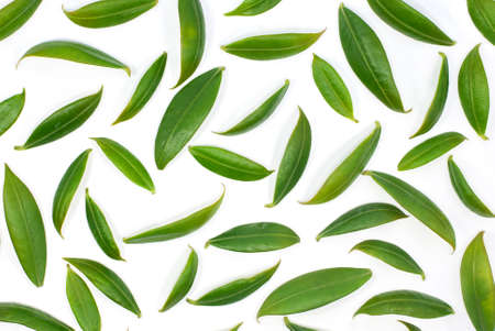 Wet green leaves arranged diagonally symbolizing wind force on a white background. Natural minimal background.