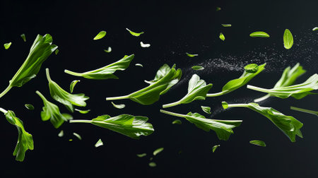 Vibrant arugula leaves are suspended in mid-air against a dark backdrop, highlighting their fresh appearance and intricate details in a captivating visual display, AI generated