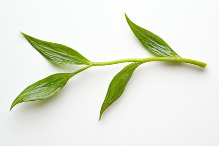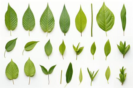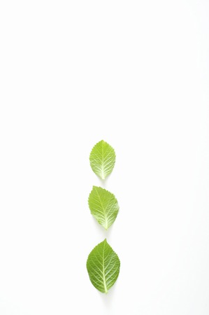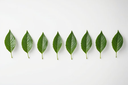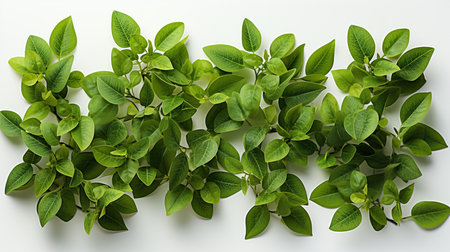 Close-up of green leaves on a white background, showcasing natural plant details and textures.