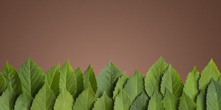 A background of green leaves isolated on a brown background with space for text. A combination of green and the trending color of 2025 - Mocha Mousse.