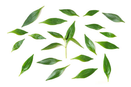 Green fresh basil leaves (Ocimum basilicum) pattern texture on white background. Herbal medicine plant concept.Top view. Flat lay.