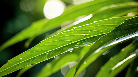 This close-up image showcases vibrant green leaves adorned with glistening raindrops, evoking a fresh and serene atmosphere that highlights nature's beauty.