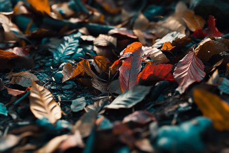 Vibrant hues of red, orange, and yellow cascade across the ground, where fallen leaves mingle. Autumn's cool air stirs memories as nature prepares for winter, showcasing seasonal beauty.