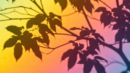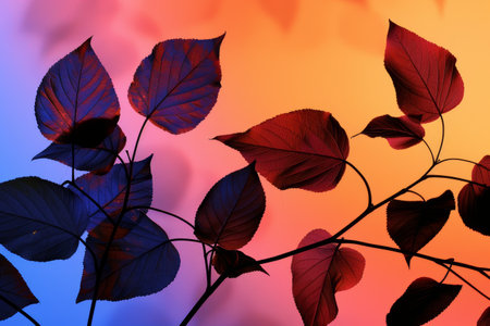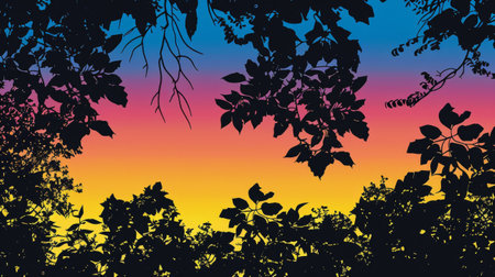 silhouette of tree branches and leaves on colorful gradient background.