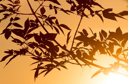 Silhouette of twigs and leaves (Dipterocarp) on an orange sky background At sunset The feeling feels lonely. Light of power.
