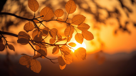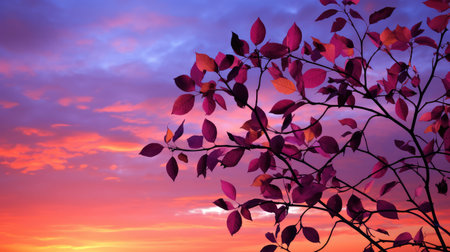 Silhouette of Leaves Against Colorful Sunset Sky for Nature and Tranquility Themes