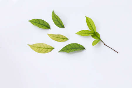 Green leaves isolated on white background. Avocado leaf lies on white surface. Natural background. Leaf texture.
