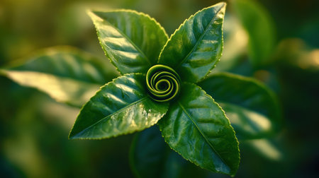 Delicate tea leaves spiral beautifully, capturing the essence of nature in a tranquil garden under bright sunlight.