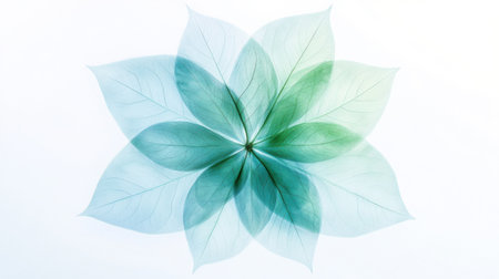 Delicate layers of leaves create a floral design, showing various shades of green against a soft white backdrop.