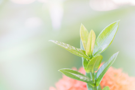 The Ixora in spring, fresh green leaves, soft sunlight filtering, vibrant atmosphere full of vitality, natural textures, serene mood P.