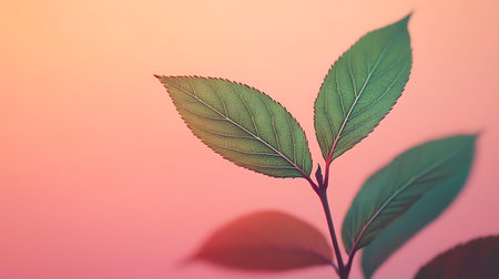 Green leaves on a pink background with copy space for text or image.