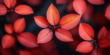 This close-up image showcases a plant with striking red leaves and small red flowers contrasted against teal foliage. The composition employs a shallow depth of field, highlighting the textures and details of the natural elements. This image could be used for various projects including design, editorial, or commercial applications.