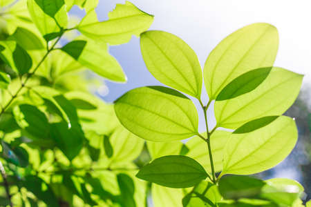 Selective focus closed up tropical summer green leaf background with sunlight.