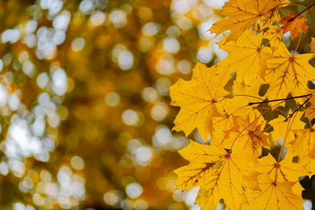 Autumn background. Tree branch with maple leaves on a blurred background. Autumn design background with yellow leaves. Copy space