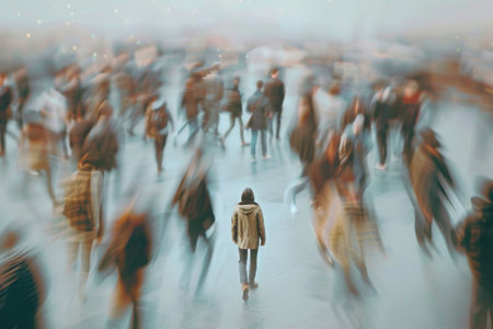 A person stands in focus amid a motion-blurred crowd in a bustling metropolis, captured with long exposure to symbolize loneliness within urban chaos
