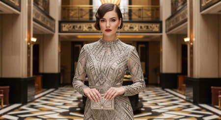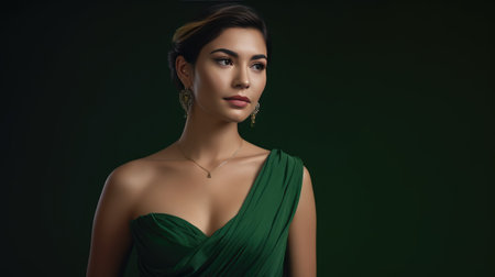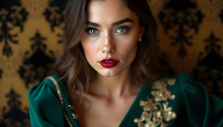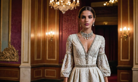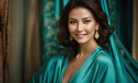 A stunning woman is wearing an elegant gold dress and is gracefully standing in front of a luxurious curtain, the backdrop enhancing her beauty