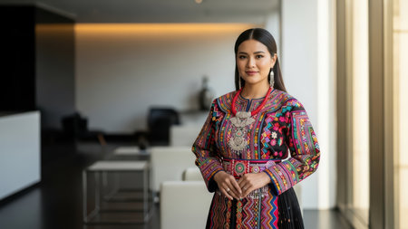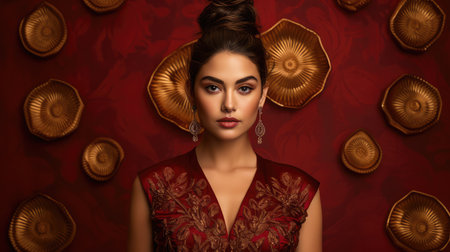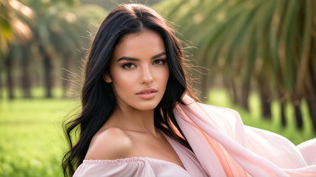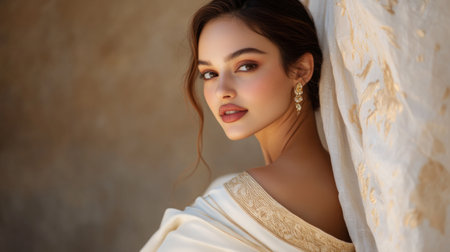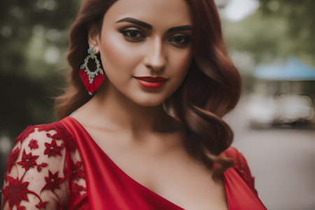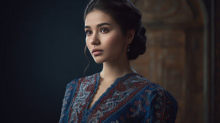 A beautiful woman in traditional attire poses gracefully outdoors, showcasing her elegance and charm. Soft lighting highlights her serene expression and intricate details.