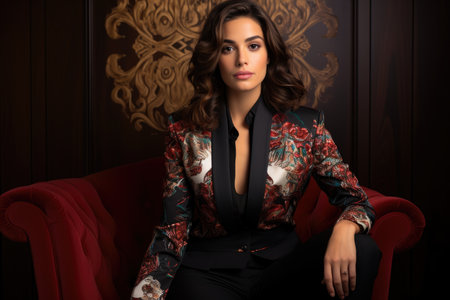 A woman in a red suit sitting on the arm of an upholstered chair, AI