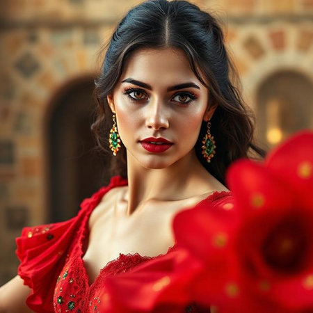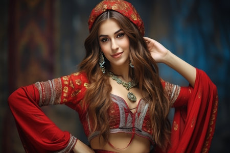 Young attractive gypsy woman with long hair dancing in traditional red seductive clothes