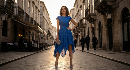 a woman in a blue dress poses confidently on a european street with buildings and people around her. This image features a transparent background, making it versatile for various design projects.