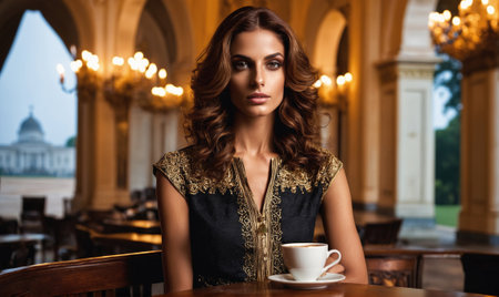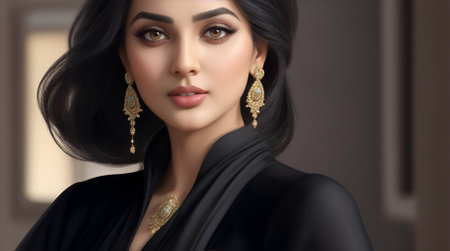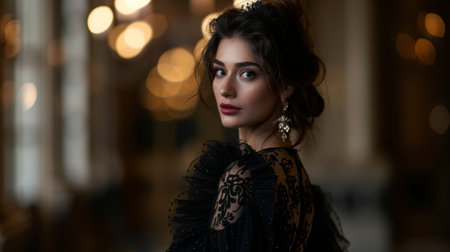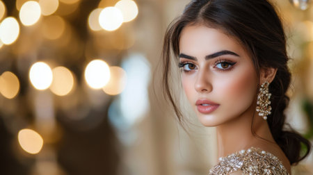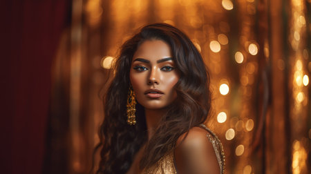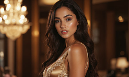 Elegant Woman with Striking Eyes and Lush Hair. A woman with striking eyes and lush dark hair poses against a blurred background with golden bokeh, exuding elegance and confidence.
