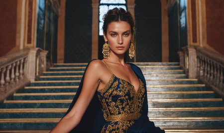 A woman in a blue and gold gown stands on a staircase in a grand building