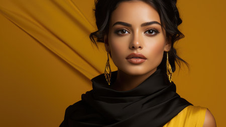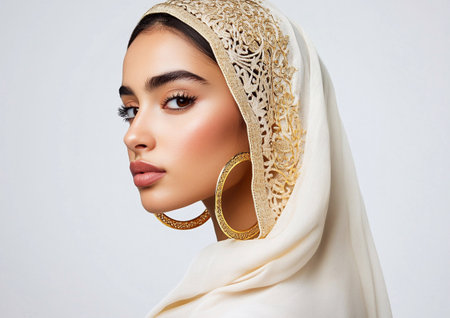 Young glamour beautiful middle eastern woman wearing golden earrings and modern silk hijab on grey studio background.AI Generative.