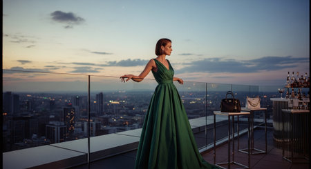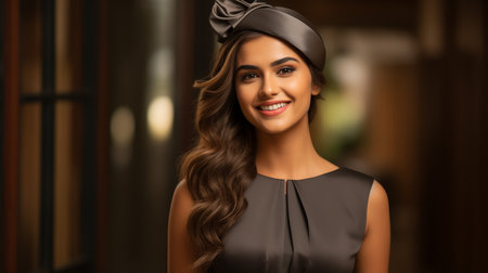 Woman Portrait, Elegant Pose, Dark Interior: Stylish brunette model poses confidently in a dimly lit upscale room, circa 2020s, for fashion or beauty purposes.