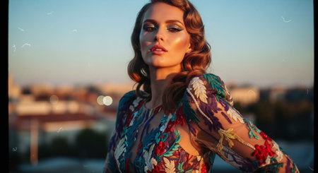 A woman with wavy hair wearing a colorful embroidered dress, posing against a sunset backdrop, showcasing vibrant makeup and a confident expression