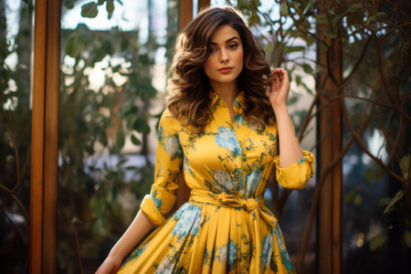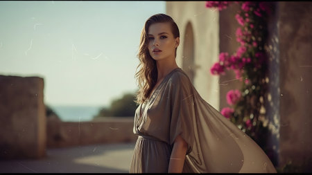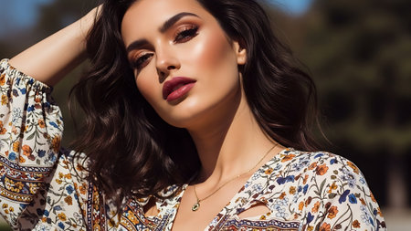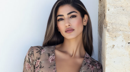 A woman stands gracefully against a textured stone wall showcasing her floral outfit. Her long hair flows gently reflecting sunlight as she offers a confident expression in a bright atmosphere.