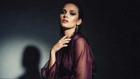 Fashion portrait of young sensual brunette woman in purple silk dress