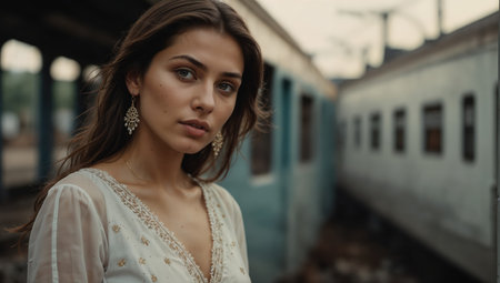 Portrait of a beautiful girl in a white dress on the background of an old train station