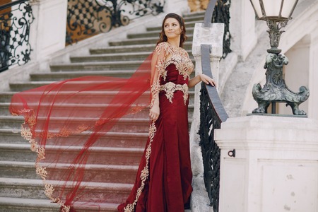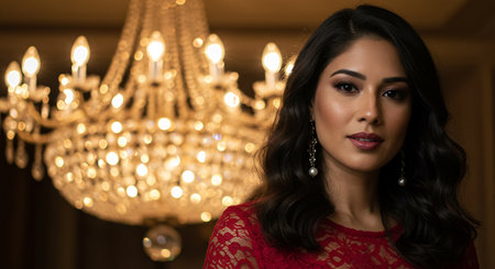 Beautiful young Latina woman in a red dress in a luxurious interior