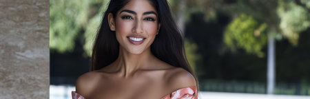 A young woman with long flowing hair smiles confidently while wearing a colorful floral outfit and large hoop earrings. The backdrop features a contemporary interior filled with soft light.