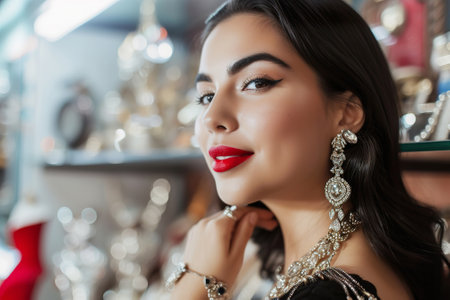 Young woman trying on elegant vintage jewelry at pawn shop counter.