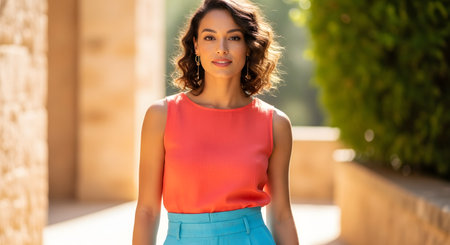 A stylish woman with wavy brown hair, wearing a bright coral-pink sleeveless top and light blue trousers, stands outdoors. She is looking confidently at the camera, with a softly blurred background of a stone wall and green foliage.