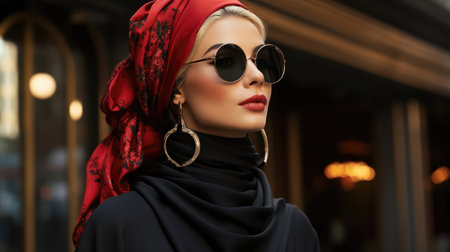 A beautiful Arab girl model is elegantly dressed in a headscarf and glasses. This image showcases her stylish and sophisticated appearance, highlighting the blend of traditional and modern fashion elements.