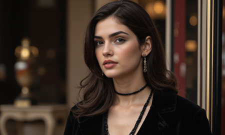 Woman Paris Fashion Portrait: Elegant model poses stylishly outdoors, showcasing jewelry and velvet attire.