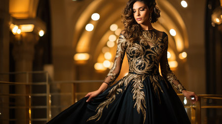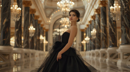 A elegant woman in a classic black evening gown poses gracefully in a grand ballroom.