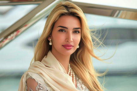 A woman stands confidently showcasing her long flowing hair and striking features. She wears a beautifully patterned scarf that complements her look set against a bright backdrop suggesting daytime.