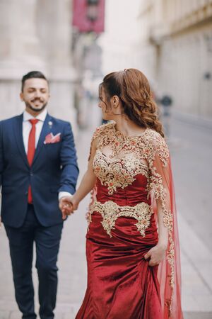 Portrait of beautiful young woman with makeup in fashion red dress.