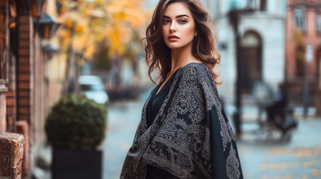 A model wearing an elegant shawl over a little black dress, standing in a chic urban setting