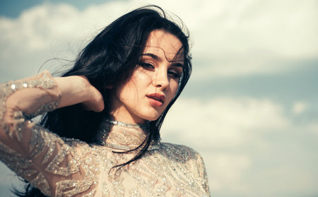 A stunning woman in an elegant gown poses with her long dark hair blowing dramatically in the wind. The fashion-forward portrait captures movement, beauty, and confidence.