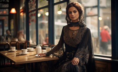 An AI illustration of A stylish young woman sitting at a wooden table in a restaurant.
