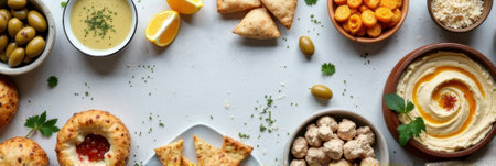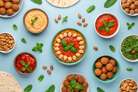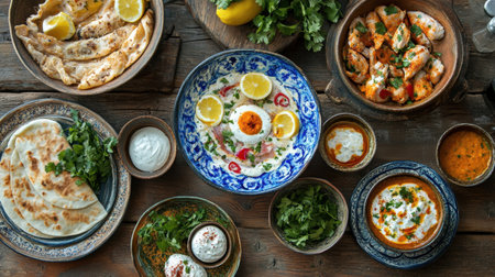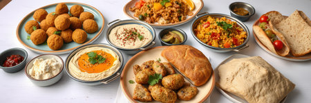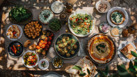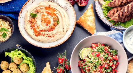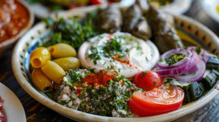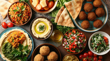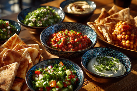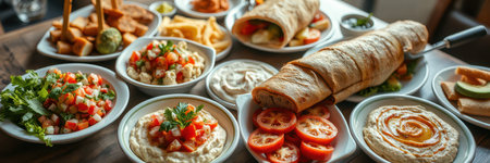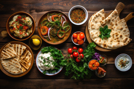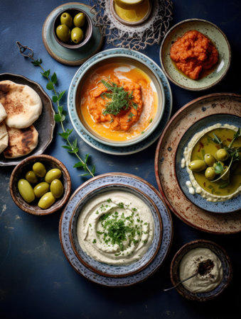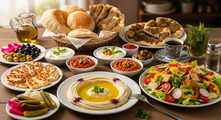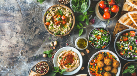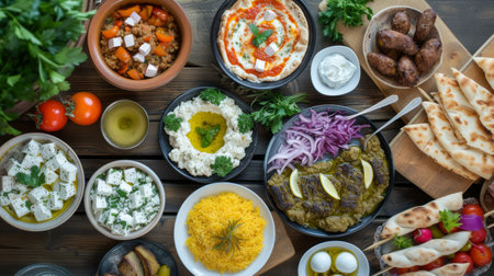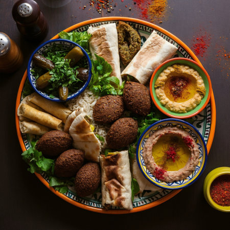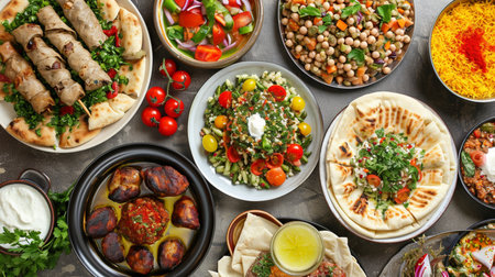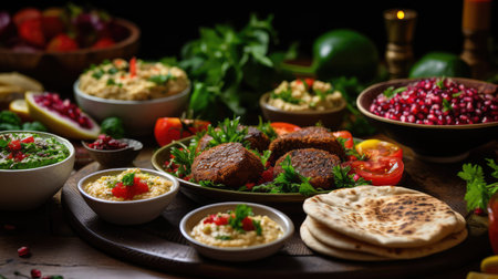 Delicious spread of middle eastern cuisine featuring fresh ingredients, vibrant colors, and aromatic spices, perfect for showcasing cultural dishes