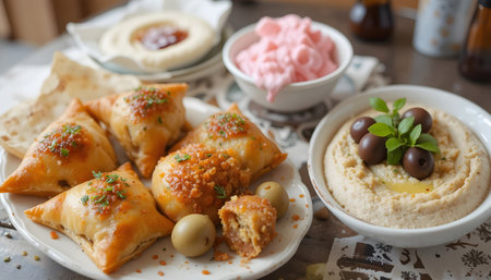 A delicious Middle Eastern spread of samosas and hummus on a table