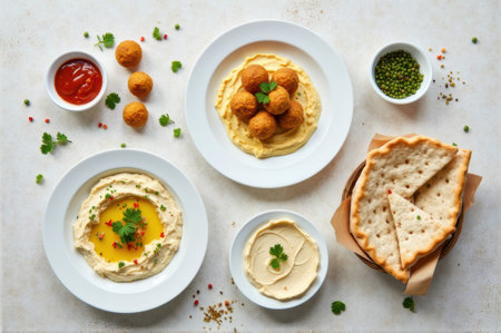 Middle Eastern mezze platter featuring hummus bowls, crispy falafel, warm pita bread, and colorful garnishes on traditional decorated ceramic plates for authentic Mediterranean dining experience.