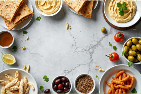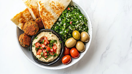 Mediterranean cuisine with hummus, olives, and fresh herbs on marble background. That the image is generated using AI.