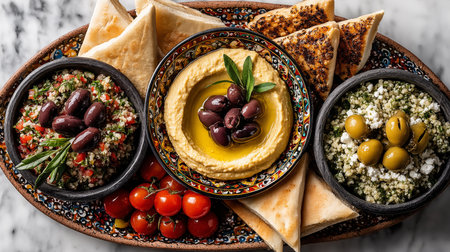 Mediterranean appetizer spread with hummus, olives, and flatbread on marble surface. That the image is generated using AI.